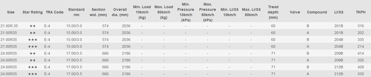 This tyre for rigid dumpers has a closed pattern and is therefore suitable for extreme applications where the risk of collisions is high. During various tests, this tyre has shown excellent results compared to comparable tyres from other manufacturers. The compound varies depending on the unit size.