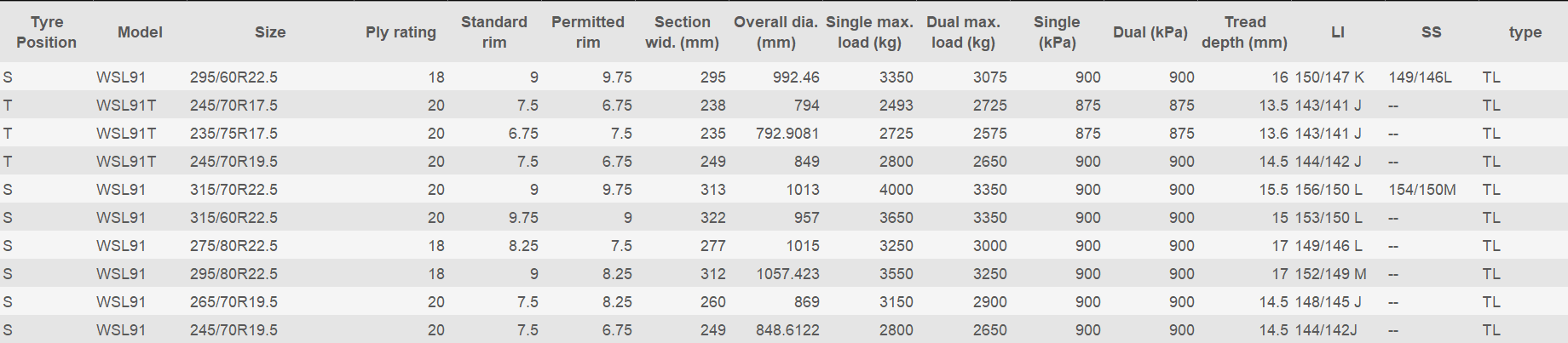 The Windpower WSL91 is a new and improved version of the WSL60, with increased rubber volume and a closed shoulder design which provides up to 25% more milage compared to the previous generation product. Available in both a steer/trailer (4 grooves) and trailer configuration (3 grooves), the WSL91 & WSL91T are optimised for line-haul trucking and heavy haulage. It is performs quietly and with stability across good road surface conditions with great braking and low rolling resistance.